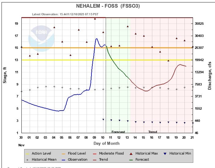 After safely surviving the the sodden drive home, I arose the following morning anxious to learn what light the sea of available data might shed on my wonderings of the previous night. How much rain did fall? How high were the rivers rising and might they rise? After seeing that one of our home rivers, the Nehalem, had risen above flood stage, I scanned through lessons to be learned from the hydrographs of other rivers across the region.