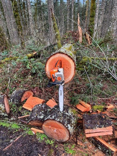 The steady, driving February rain ponds down on my helmet. The tenacious roar of the saw in my wet hands drowns out the sound of the rain. I’m surrounded by the forest – sleeping deeply through the seemingly lifeless depths of another winter. Downed wood rots, fallen leaves crumble and decay, no birds sing. In the course of every winter, at least one major wind event rearranges parts of the forest, blowing down and breaking off trees, exposing tipped up root wads. This round of high energy weather, like most others, is accompanied by heavy precipitation which loosens the soil and increases the blow downs. Time has taught us to expect and treat these events and the related work as just a normal part of our annual round of taking care duties. As soon as the high winds move on, we discover more than a dozen trees down and blocking the forest’s main road. With our forest caretaker blocked in by the fallen trees, and needing to make a meeting in town, there is some urgency to get the logs cut and moved. With diameters ranging from twelve to twenty six inches, this will require time and energy. This needs to happen. With the big saw up and running, cutting round after round, before long I feel the cold rain finding its way through my rain gear and down my back. The other feeling in my back is pain resulting in an earlier injury from doing work that was once fine and easy but has become increasingly challenging. Moving from the first log on to the next, I counsel myself “yes, get the work done, but try not to do any more damage”. So far, so good. Balancing taking care of both the forest and myself.